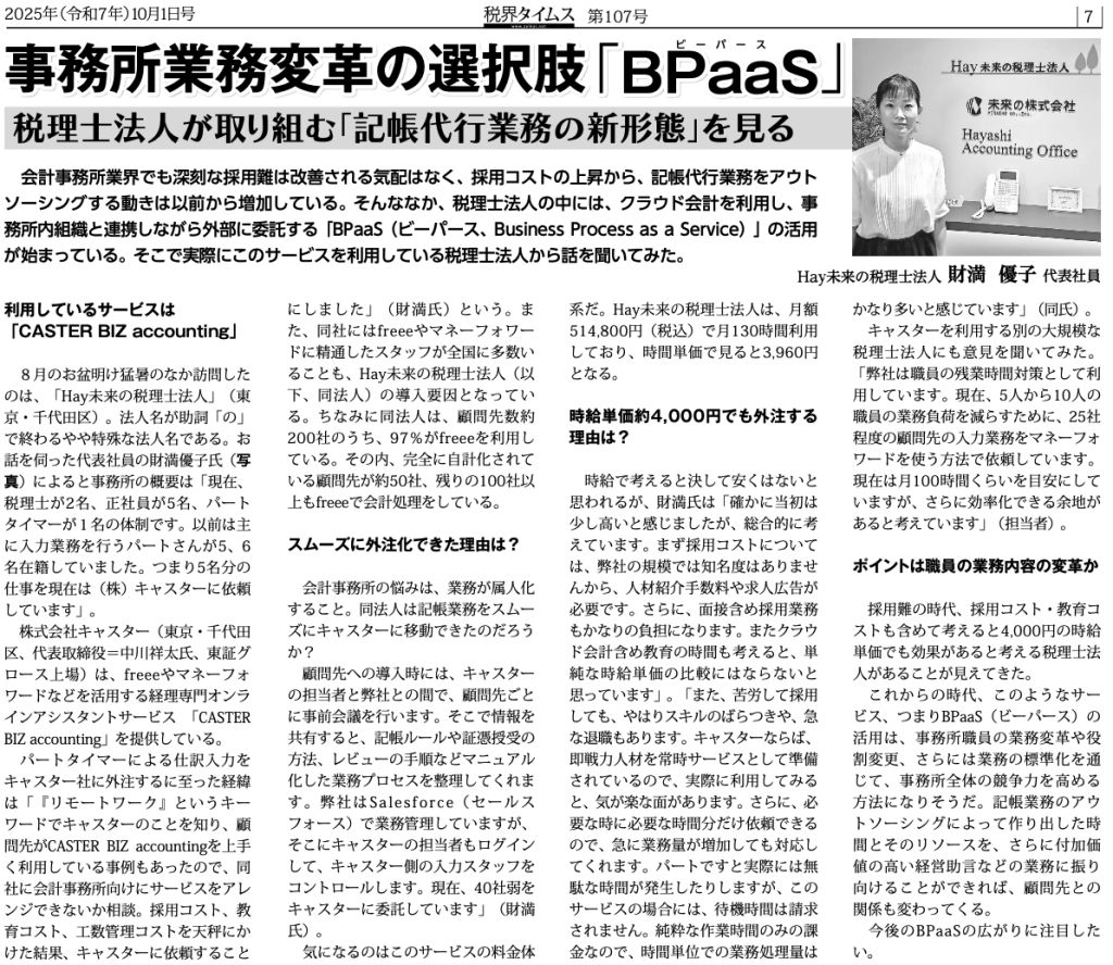 「税界タイムス」第107号(2025年10月1日号)にCASTER BIZ accountingが掲載されました。税理士法人が抱える採用難や採用コストの上昇といった課題に対し、BPaaS(Business Process as a Service)を活用する新たな選択肢として、CASTER BIZ accounting を導入いただいた事例をご紹介いただいています。